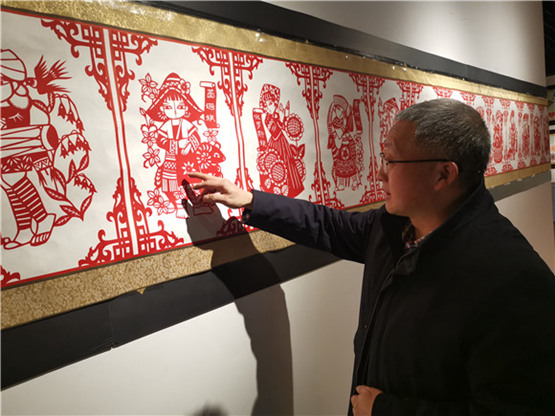 走進巫溪縣博物館一樓的展覽廳,一張長24米的紅色鏤空巨幅剪紙顯現在眼前,這便是曾德元的得意作品《56個民族大團結》。
