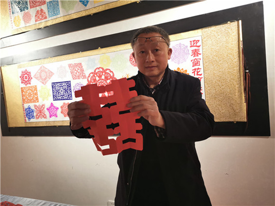 曾德元展示2分鐘內剪出的喜字。華龍網—新重慶客戶端 冉長軍 攝