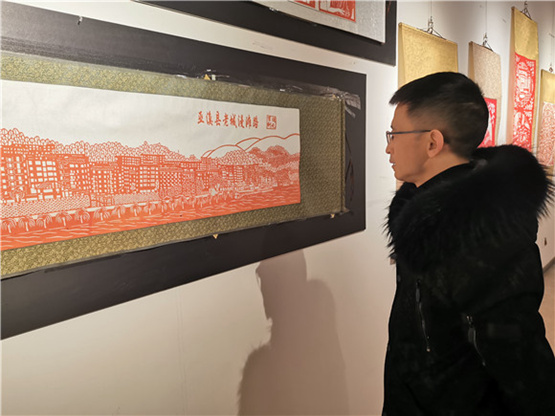 市民觀看曾德元剪紙作品《老城漫灘路》。華龍網—新重慶客戶端 冉長軍 攝