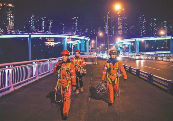 1月11日,菜園壩大橋,工人們攜帶著燈飾維修裝備準備上橋。