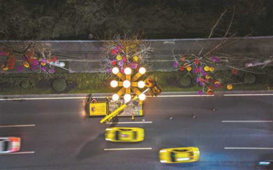 1月15日,南濱路,南岸區照明管理處的工人正在測試維修后的路燈。