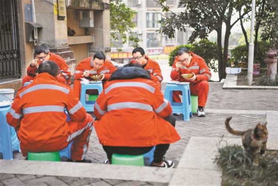 1月13日,南岸區彈子石,工人們在街頭匆匆用餐,很快又要投入工作。