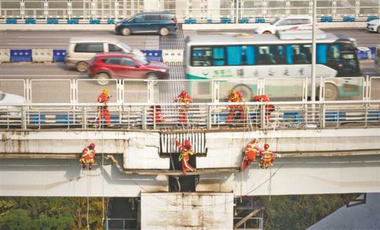 1月11日,鵝公巖大橋,工人們懸掛在橋的一側作業。