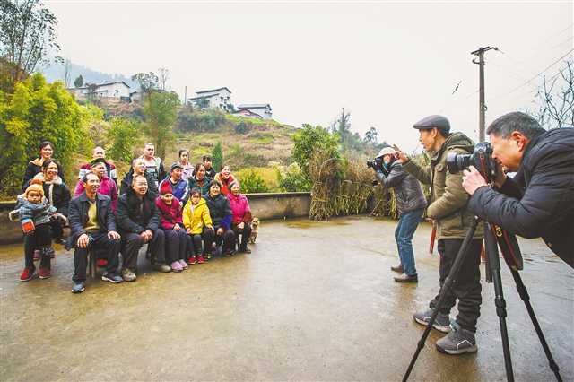 1月28日,綦江區東溪鎮白云村,攝影志愿者正在給四世同堂的帥承祥一家拍攝全家福。