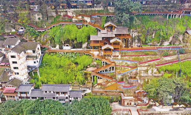向上行至大約400米處,一個吊腳樓群矗立在此——由7座小型吊腳樓組合而成,步道從中穿插而過,凌空而上,如飛檐走壁一般。吊腳樓的上方,多棵黃葛古樹和一段長約150米的人工城墻保存完好。