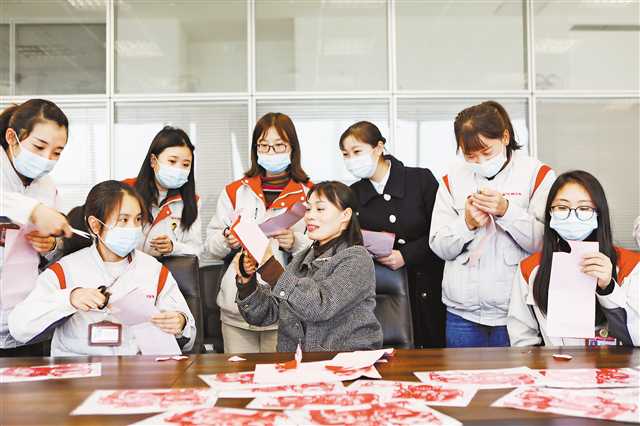 作為活動的一部分,市級非遺傳承人唐禮茂(前排中)現場教學,向女工們傳授歷史悠久的剪紙技藝。女工們跟著老師一步步折紙、動剪,有模有樣地學習起剪紙技法。很快,一幅幅飽含美好寓意的“牛轉乾坤”剪紙就躍然眼前。 特約攝影 陳仕川/視覺重慶