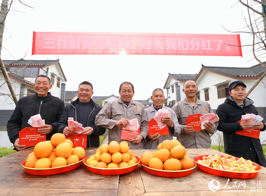 去年1月20日,青龍村生產互助農業股份合作社正式成立。依托渝北區實施農村“雙十萬工程”,栽植大雅、沃柑、血橙等優質晚熟品種,并按照“一社三部”模式進行經營。短短1年時間,該合作社實現純收益187萬元。當天,合作社拿出101.2萬元紅利,分享給517戶“股東”,平均每戶可分紅近2000元。
