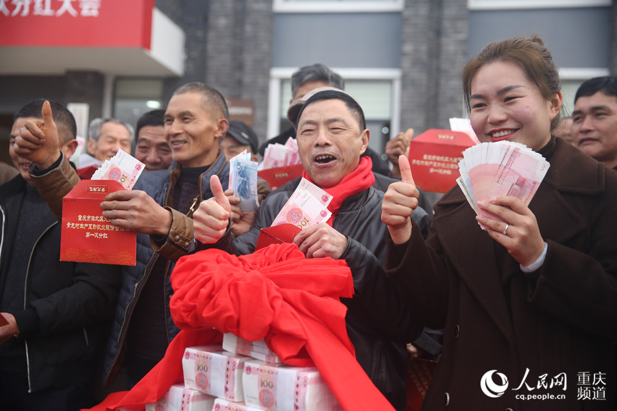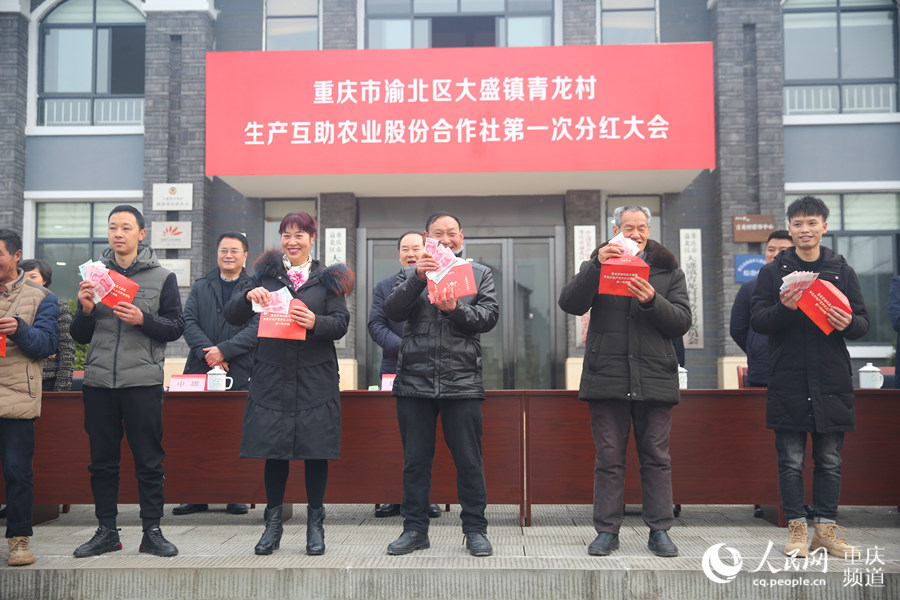 2月9日,重慶市渝北區大盛鎮青龍村張燈結彩、喜氣洋洋——不光因為春節即將來臨,更是因為青龍村生產互助農業股份合作社舉行第一次分紅大會。合作社“股東”依次上臺領取分紅,一手拿著股權證,一手拿著大疊現金,每個人臉上都樂開了花。