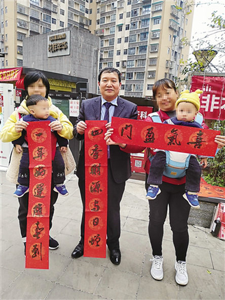 記得在小時候,老家門上的春聯都是手寫的,如今雖批量印刷的春聯多了,但手寫春聯是中國春節的傳統文化,因此我家的春聯一直以來都是手寫。我不只給自己家寫春聯,十多年來,除了參加重慶市、區書法家協會和部分街道、社區、企業組織的寫春聯活動,還自己買了很多對聯紙,在住家附近免費給市民寫春聯送祝福,每年春節都要寫好幾百幅。