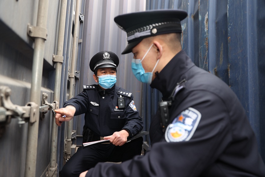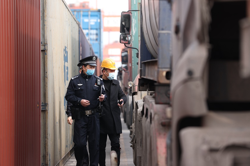 民警雷激(右)和同事對進出中心站集裝箱裝載區貨車進行巡查。胡勇攝