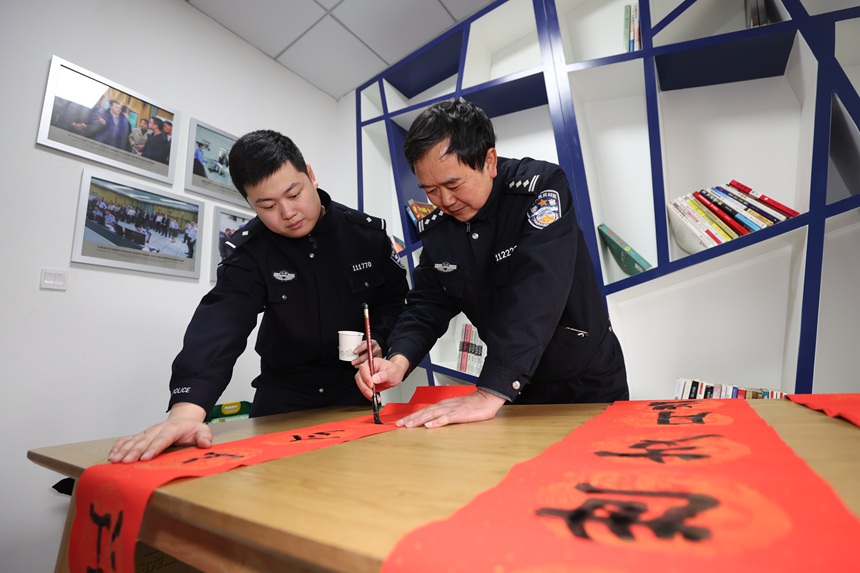 雷激(右)和同事書寫春聯迎新年。胡勇攝