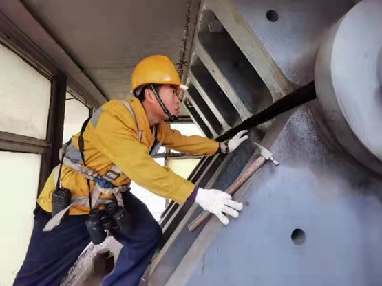 要下到橋墩頂面,要先后通過兩個直立的檢查梯和一條斜度約45度的狹窄通道,眼下是深不見底的長江,普通人往下看一眼心里就直冒汗。走在上面時,橋上不時有火車通過,產生的強烈震動讓人心驚膽顫,雙腿不停地顫抖,王飛和他的同事不僅要在狹窄的通道行走,還要檢查每顆連接螺栓的工作狀態,這不僅需要過人的眼力,還需要豐富的經驗,每一步都充滿危險和挑戰。已經擁有8年工作經驗的王飛已經熟練到通過檢查錘與連接螺栓的碰撞聲就能判斷其工作狀態。