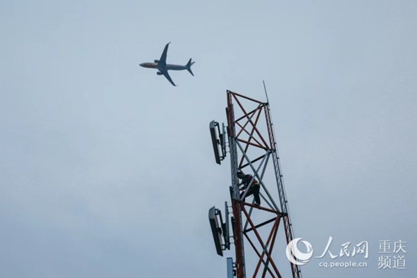 母科峰在導航臺天線鐵塔上巡查,一架飛機從他頭頂飛過。鄒樂攝