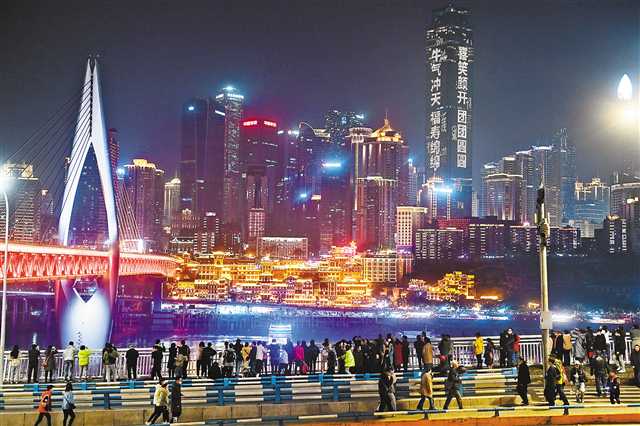 山城夜景是重慶的名片,夜游更是重慶旅游的特色。春節假期,不少市民和游客走上街頭、來到江邊,賞新春燈飾、逛山城夜景,感受不一樣的城市風貌。圖為2月16日,市民正在北濱路欣賞燈光璀璨的山城夜景。首席記者 龍帆 攝/視覺重慶