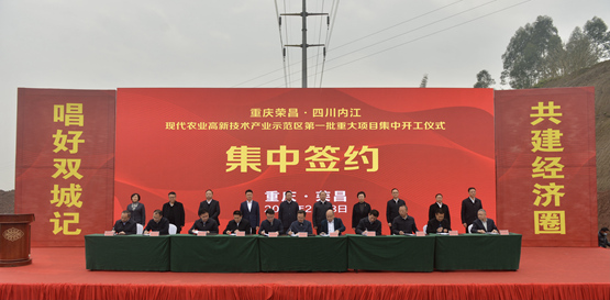 人民網重慶2月18日電 18日,內江榮昌現代農業高新技術產業示范區2021年第一批重大項目集中開工儀式暨現場考察活動在重慶榮昌、四川內江兩地舉行。