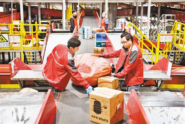 2月18日,京東亞洲一號重慶巴南物流園,分揀工作人員在自動分揀線上忙碌。當日,京東重慶物流園發出約30萬個包裹。記者 謝智強 攝/視覺重慶