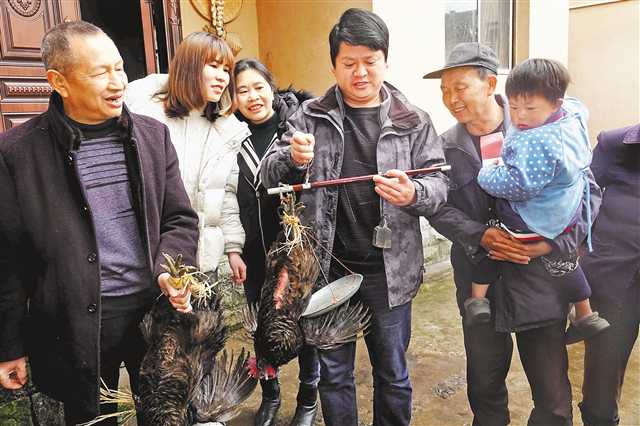 2月18日,節后上班第一天,萬盛經開區萬東鎮五和村駐村第一書記謝豪 (左四)正在為村民銷售農家土雞。特約攝影 曹永龍/視覺重慶