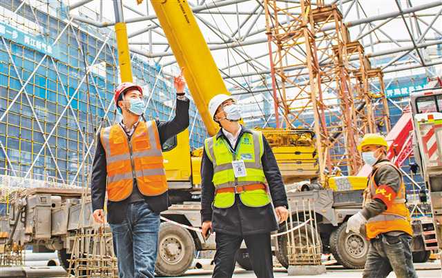 2月18日,在禮嘉智慧公園智慧館項目工地上,兩江產業集團禮嘉工程中心主任趙斌(左)正在檢查智慧館屋頂安裝推進情況。春節期間,智慧館建設加班加點干,確保了項目進度。整個項目預計今年7月底完工。記者 張錦輝 攝/視覺重慶