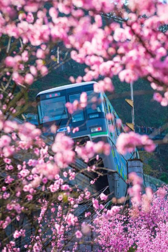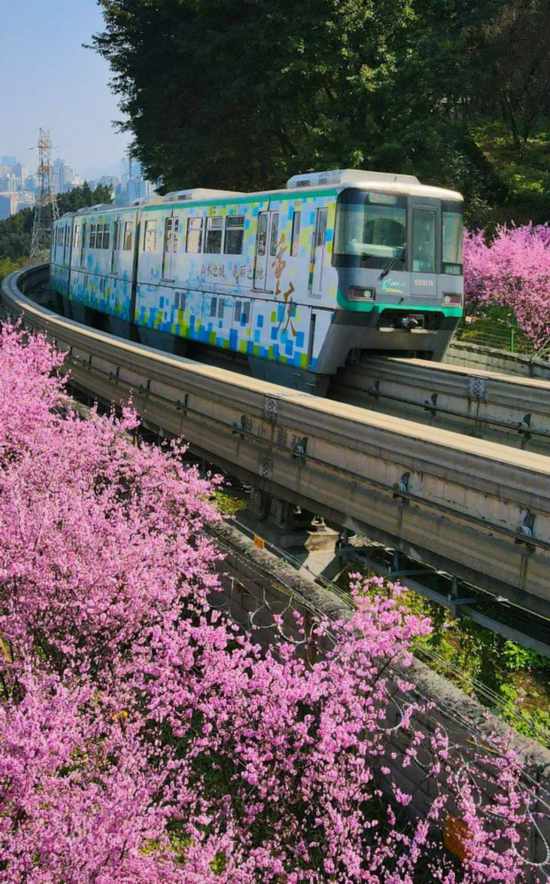 近日,重慶軌道交通2號線佛圖關段,大面積的美人梅花盛開,單軌列車穿行在花海中,如開往春天的列車,成為一道城市亮麗的風景線。鄒樂 攝