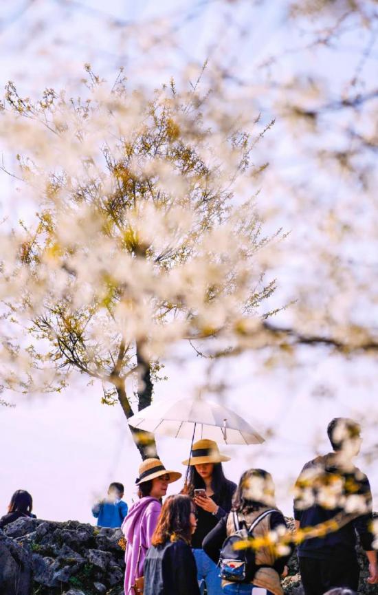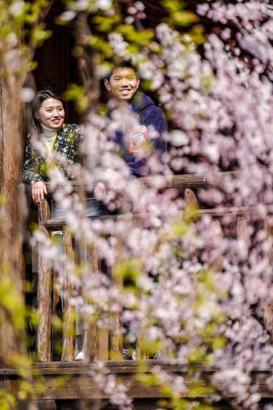 2月21日,游客在渝北區大盛鎮觀賞櫻花,花好景好露出的笑容也格外好。羅嘉 攝