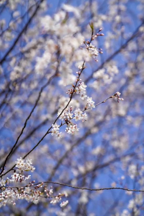 雪白的櫻花在藍天的襯托下分外美麗。羅嘉 攝