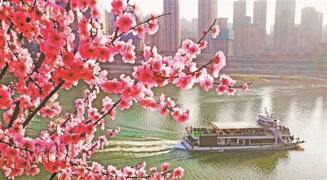 二月十九日,北濱路,美人梅迎風綻放,載著乘客的輪船仿佛在畫中游。特約攝影 鐘志兵\視覺重慶