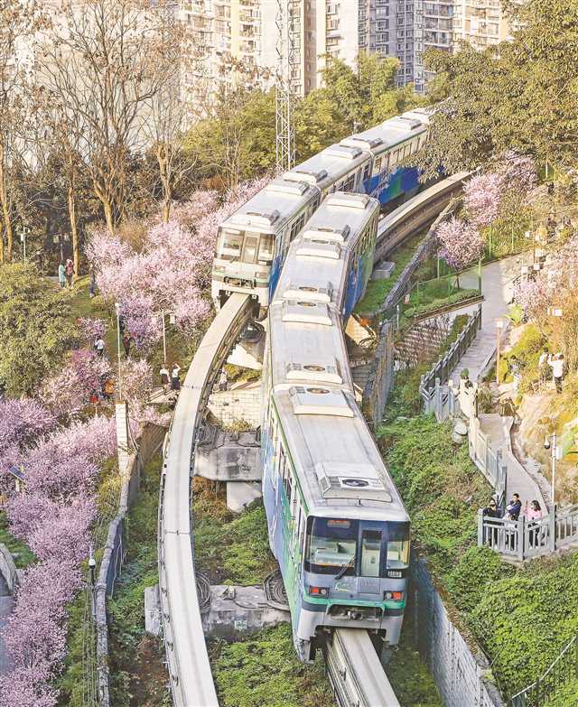 二月十九日下午,軌道交通二號線渝中區佛圖關段,單軌列車穿梭在花海中。記者 蘇思 攝\視覺重慶
