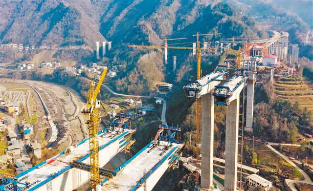 2月23日,城開高速任河特大橋正在加緊施工。該公路全長約128公里,橋隧總里程約100公里,橋隧比近78%,是我市迄今建設難度最大的高速公路之一。今年開州譚家至趙家段50公里將先行通車。記者 崔力 攝/視覺重慶