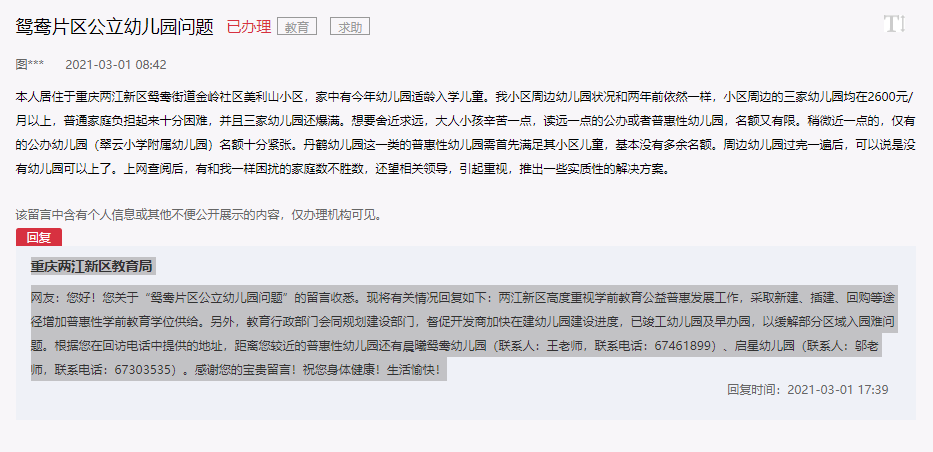 此外,根據網友提供的地址,兩江新區教育局還推薦了距離其家較近的兩所公立幼兒園聯系方式。