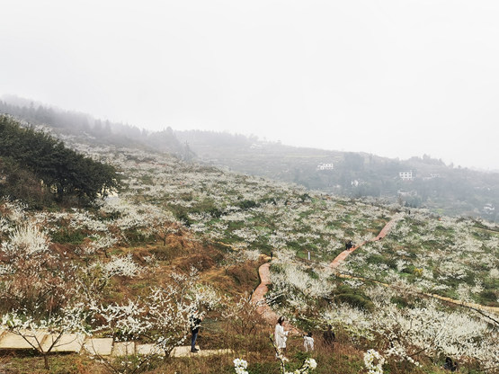 從李花源景區高處俯瞰,漫山的李樹都綻放開來,一瓣瓣、一朵朵、一簇簇如雪一般潔白,田間地頭,呈現白茫茫的一片。走進花叢小徑,淡淡花香沁人心脾,清風徐來,不時飄落的片片花瓣,游客們穿梭在花海,拍照留影,好不愜意。青山下,李花旁,潔白如雪的李花與淳樸的田園風光相結合,構成了一幅美不勝收的山水畫卷。