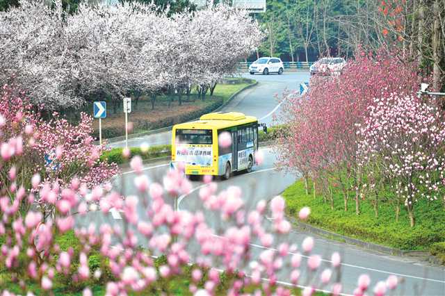 3月1日,江津長江公路大橋南橋頭立交繁花盛開,春意盎然。
