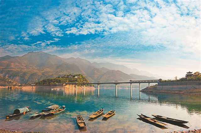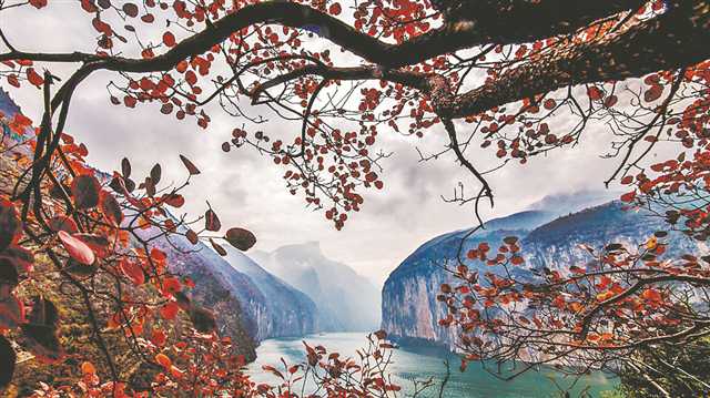 漫步在古徑幽林,看峽口那紅了又綠、綠了又紅的紅葉,撲面而來的,除了江風,還有讓人流連忘返的詩歌的清香;站在烽火臺前,撫摸那斑駁的大炮,那震天的戰鼓和越云的廝殺聲仿佛就響在耳邊,烽煙滾滾金戈鐵馬的古戰場仿佛就浮現在眼前;佇立白帝城之巔,長江三峽第一峽——瞿塘峽就展現在眼前,赤甲山和白鹽山對峙,鎖住了長江的咽喉,形成雄偉壯美的夔門;俯視腳下,昔日咆哮奔騰的長江水,如今安靜得如嫻淑的少女,輕盈地與夔門擦身而過,穿過綿綿群山延伸到遠方。一霎時,初升的太陽躍出赤甲山頂,陽光撕開布滿峽谷的晨霧,灑下一江的緋紅。江上微波粼粼,閃爍著點點金光,巍巍夔門便在這光與影的交錯中多了幾分妖嬈與嫵媚。