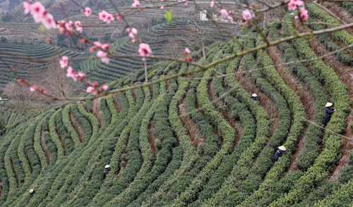 時下,浙江省麗水市景寧畬族自治縣的春茶進入采摘期。在綠意盎然的茶園里,茶農在一排排盤旋而上的茶樹叢中搶摘春茶,忙碌的身影猶如跳動的音符,演奏出一支支動人的采茶舞曲。