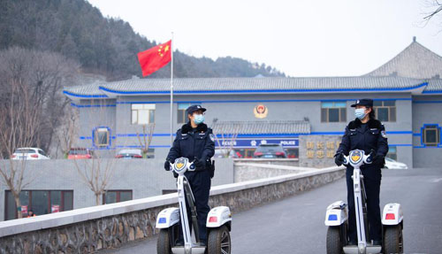3月7日,女子警隊隊員張安琪(左)、胡文輝駕駛平衡車駛出派出所,前往景區巡邏。新華社記者 陳鐘昊 攝