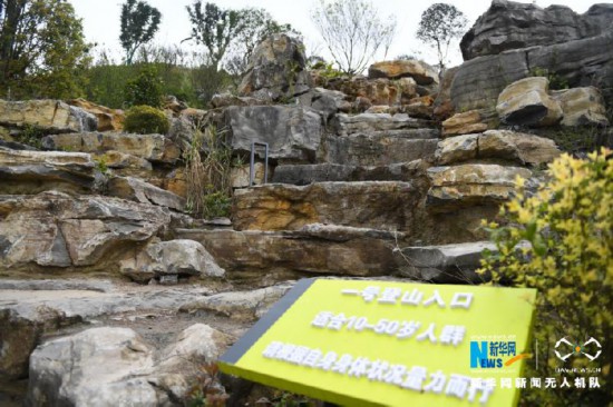 公園內有一片最大高差達70米的山坡,規劃了諸多出入口,既有坡度較緩的健康跑道,也有極具特色的綠境攀巖。新華網 耿駿宇 攝