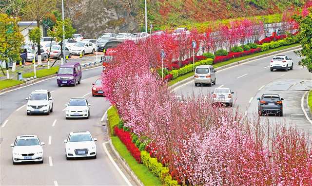 3月8日,巴南區渝南分流道,觀賞桃花提前綻放,姹紫嫣紅,美不勝收。近年來,重慶堅持“兩點”定位,“兩地”“兩高”目標,持續推動城市提升,讓重慶顏值更高、氣質更佳。據了解,重慶今年還將實施街頭綠地提質工程。按照計劃,今年將建設街頭綠地項目200個、面積200萬平方米。
