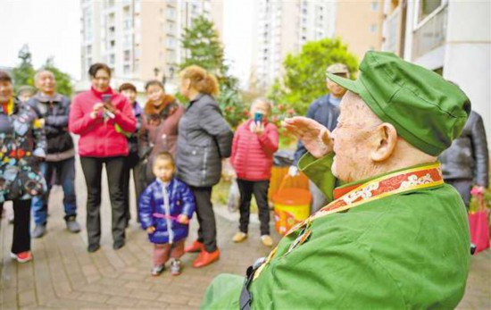 鄰居們來關心蔣誠,蔣誠向他們敬了一個軍禮。