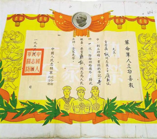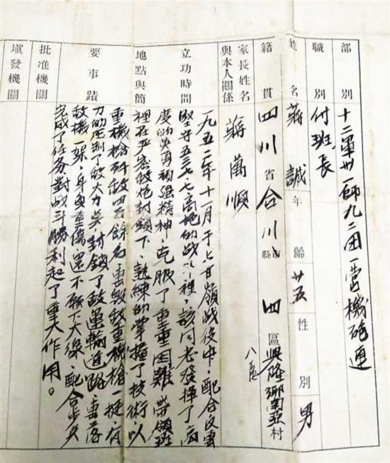 喜報載明:“貴府蔣誠同志在上甘嶺戰役中,創立功績,業經批準記一等功一次,除按功給獎外,特此報喜。恭賀蔣誠同志為人民立功,全家光榮!