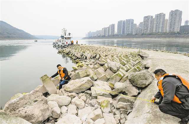 3月9日,長江航道江津段,航道工人利用枯水期排查去年特大洪峰對航道設施的損壞情況。