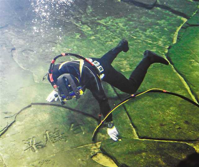 3月15日,在長江水下40多米的白鶴梁題刻無壓容器罩內,潛水員在進行清理作業。