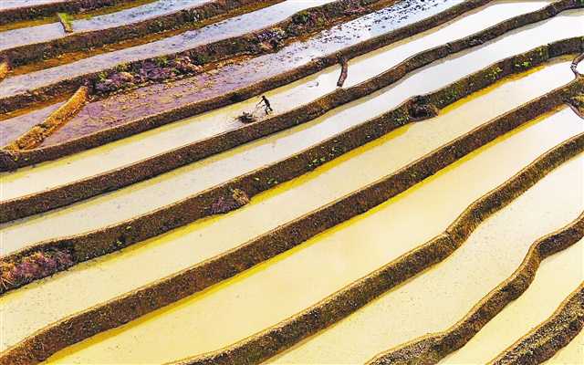 萬盛經開區石林鎮的梯田鱗次櫛比,在陽光的照耀下閃著金色的光芒。3月19日一大早,當地村民就在用微耕機整田,準備播種早稻。近年來,當地農業部門針對山區耕地地塊小、坡度大的實際,大力推廣微耕機耕作,讓微耕機成為春耕春播好“幫手”。一村民說:“使用微耕機整田,簡單好操作,比用耕?於嗔!