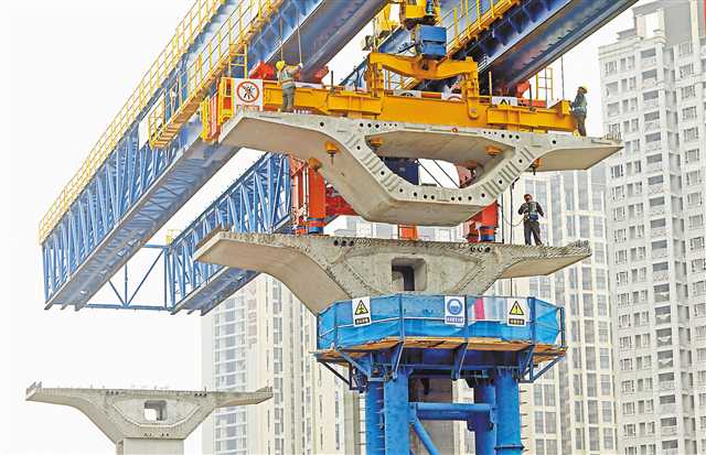 軌道18號線施工采用新技術 節段梁拼裝像空中“串糖葫蘆”