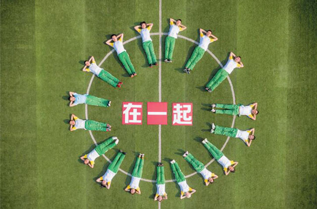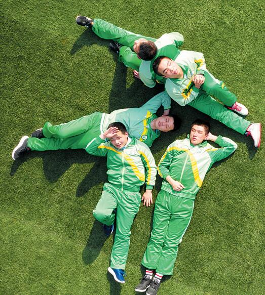 班里17個孩子,有一大半是全盲,只有少數人有微弱的視力。由于視力障礙,合影排隊在老師和攝影師的指導下完成。除了站得整齊的合照,孩子們還在攝影師指揮下,躺在學校操場草坪上擺出各種活潑的造型,任由無人機停留在自己頭頂俯拍,“哎呀好大的風呀,是直升機來了么?”燦爛的笑容一直掛在他們臉上,還不時調皮地跟身邊同學互動。