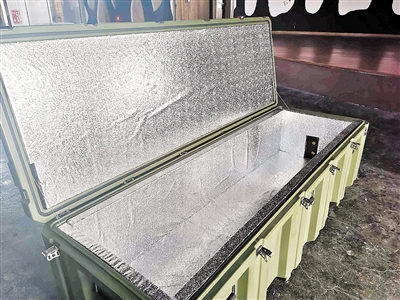 記者在重慶聲光電智聯看到,保護箱內長1.9米、寬0.6米、高0.5米,外觀是深綠色,箱子里面是銀白色的保護膜!俺涞獣屇さ谋砻娼Y水珠,這種材質叫做防凝露膜,充氮時不會結水珠,可減少環境中的水分對象牙的破壞!