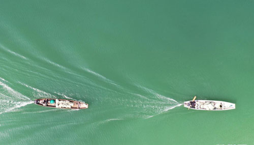 3月28日,在張家界茅巖河景區,當地村民駕船運輸清理的漂浮物(無人機照片)。