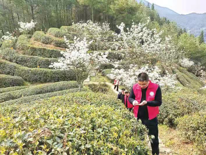 三月的青石村,花紅水暖。山腳下,房屋邊,漫山遍野一壟壟的茶樹成排延伸,與茶樹間穿梭的茶農構成了一幅美麗鄉村畫卷。
