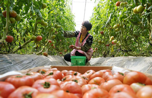 3月29日,秦皇島市撫寧區食正源蔬菜種植專業合作社社員在采摘西紅柿。