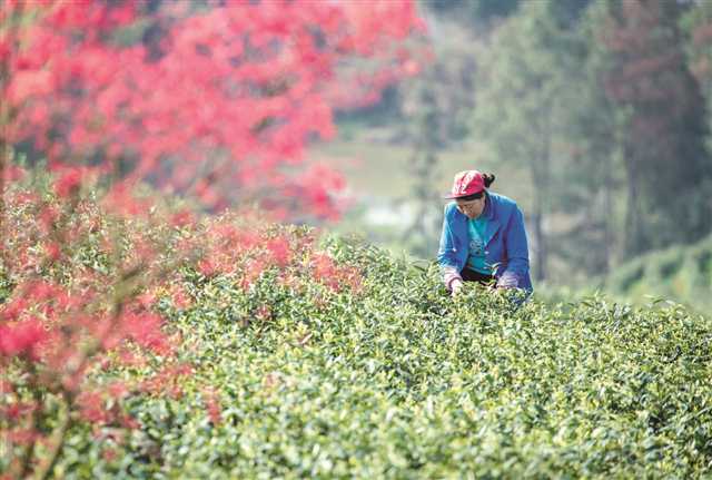 3月27日,南川區興隆鎮金花村的茶園里,4000畝茶樹爭相抽出嫩芽,200多名采茶工人腰挎竹簍,采摘新茶。