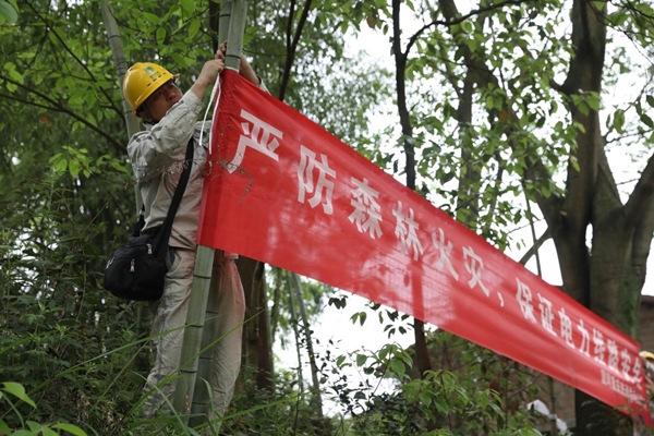 國網重慶市南供電公司運維人員在明月林場入口處懸掛安全警示標語。龔超攝