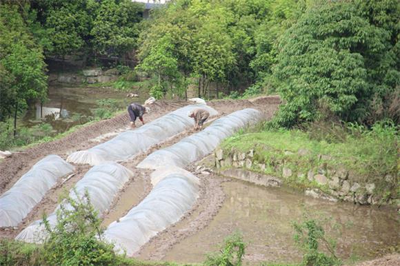 村民為稻種播后覆蓋薄膜。 通訊員 李達元 攝